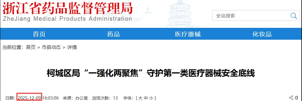 12月9日,浙江省药监局发布《柯城区局“一强化两聚焦”守护第一类医疗器械安全底线》。