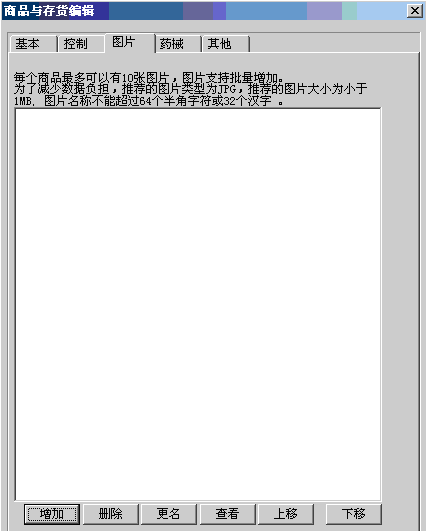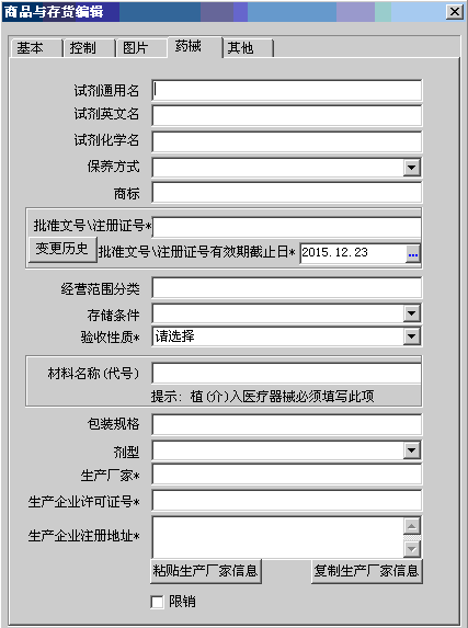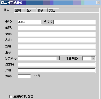 包括:名称、规格、型号、计量单位、产地、有效期;批准文号/注册证号(可记录变更信息)、有效期截止日期、储存条件、生产厂家、生产企业许可证号、生产企业注册地址;最高/低库存量控制、销售提成比例、参考价格;支持图片上传管理;提供序列号管理。